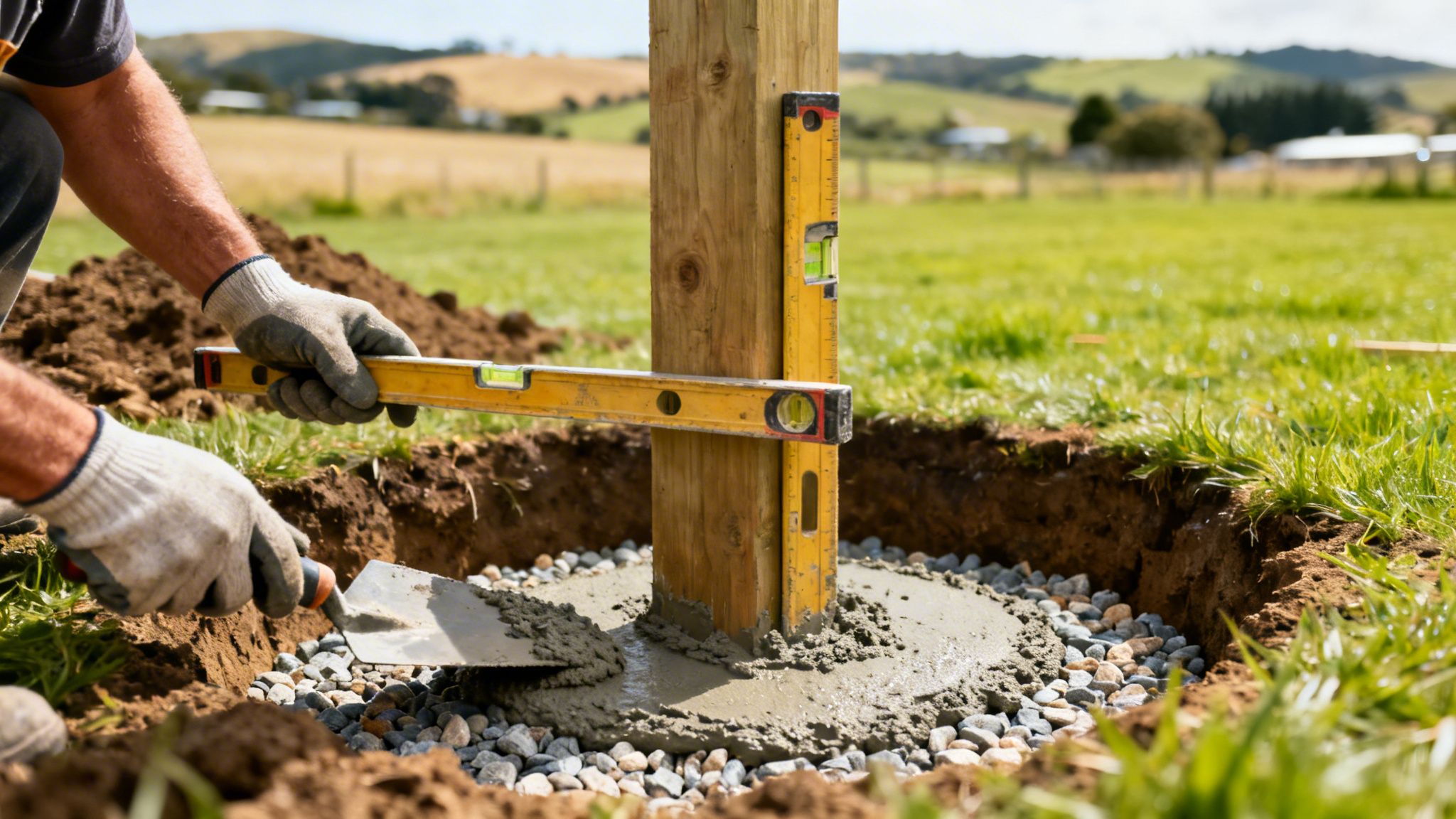 Når din stolpe er placeret i hullet, og du har dobbelttjekket med vaterpasset, at den står snorlige, er det tid til at låse den fast. Hele tricket er at bygge et fundament op omkring stolpen, lag for lag, så det bliver så tæt og komprimeret som overhovedet muligt.