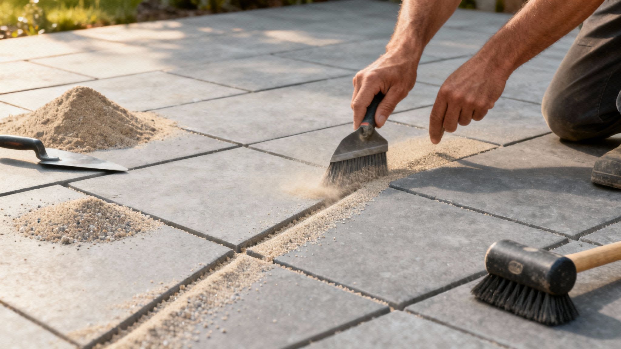 En klassisk fejl er at være for forsigtig med kosten. Du skal lægge lidt kræfter i for at massere sandet ordentligt ned. Tænk på det som at presse sandet ned i alle de små hulrum, så fugen bliver helt mættet.
