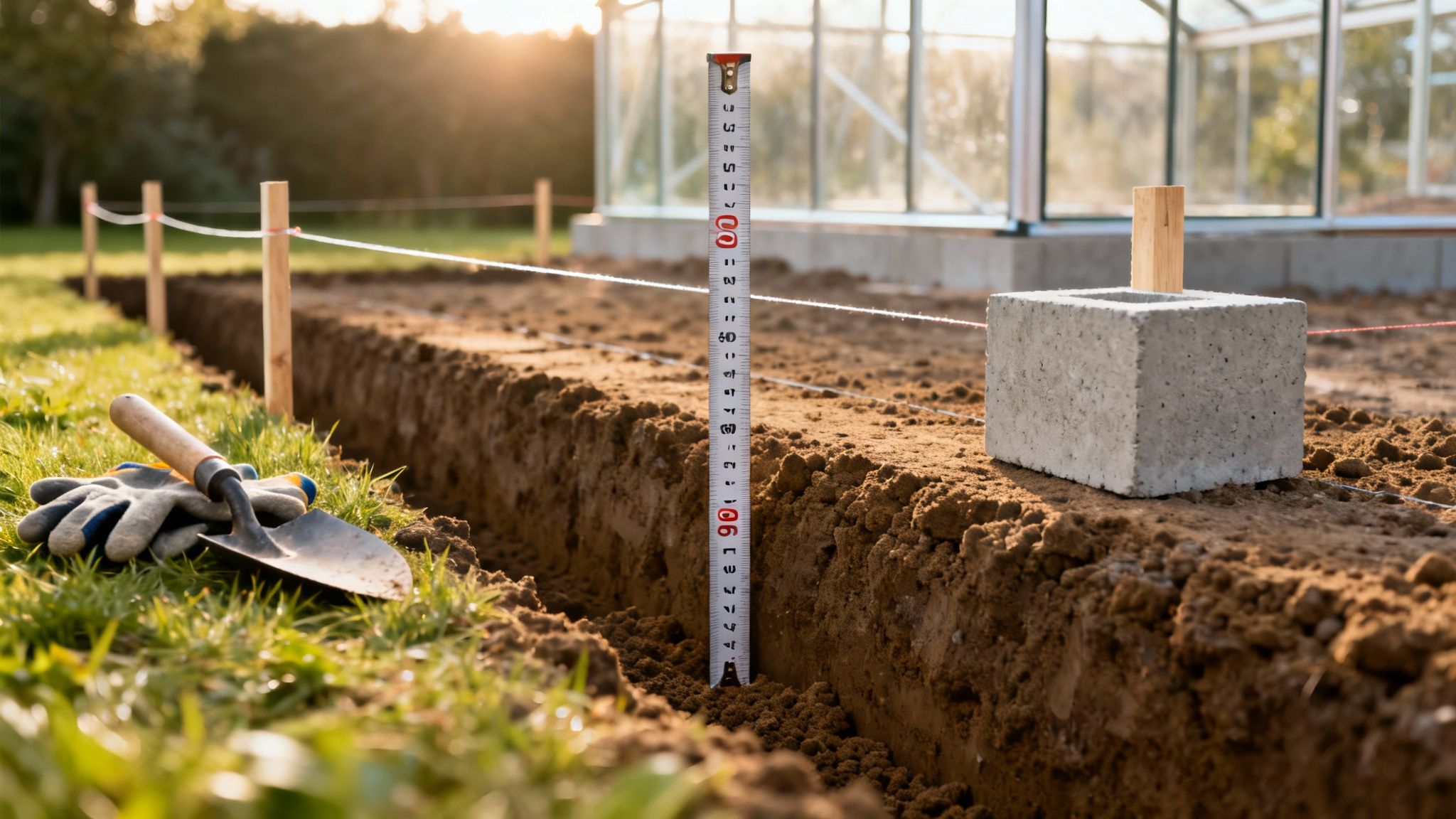 Grav ned i den dybde, din valgte løsning kræver. For en muret sokkel betyder det typisk 90 cm for at nå under frostgrænsen. Det er afgørende for, at dit fundament til drivhus ikke bliver skubbet op af jorden, når frosten – og telehiv – sætter ind om vinteren.