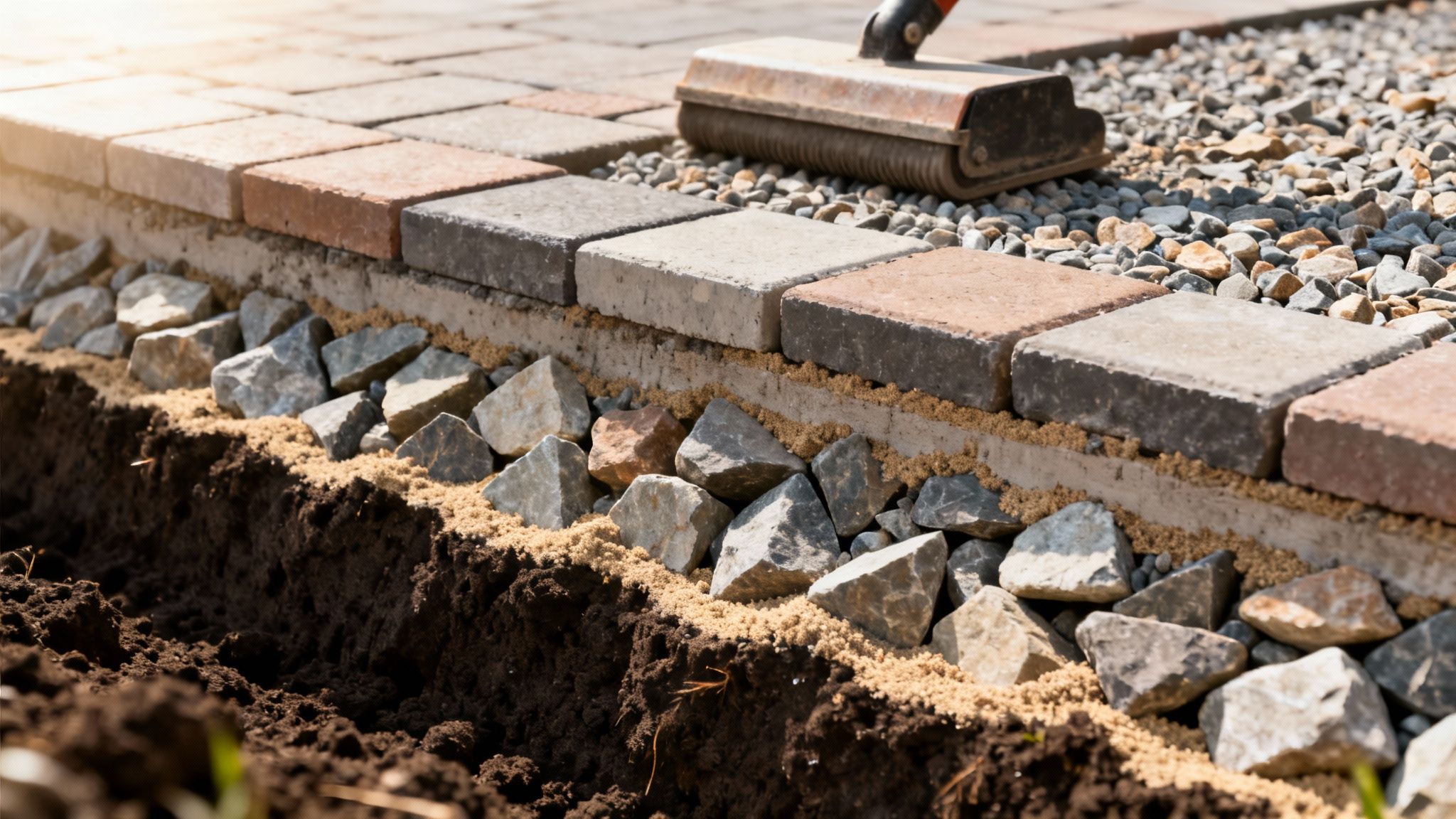 Først og fremmest graver vi ud til den korrekte dybde. Det er et kritisk punkt, for dybden afhænger fuldstændig af jordbunden på stedet og hvad området skal bruges til. En indkørsel, der skal bære biler hver dag, kræver et langt mere robust fundament end en hyggelig havesti.