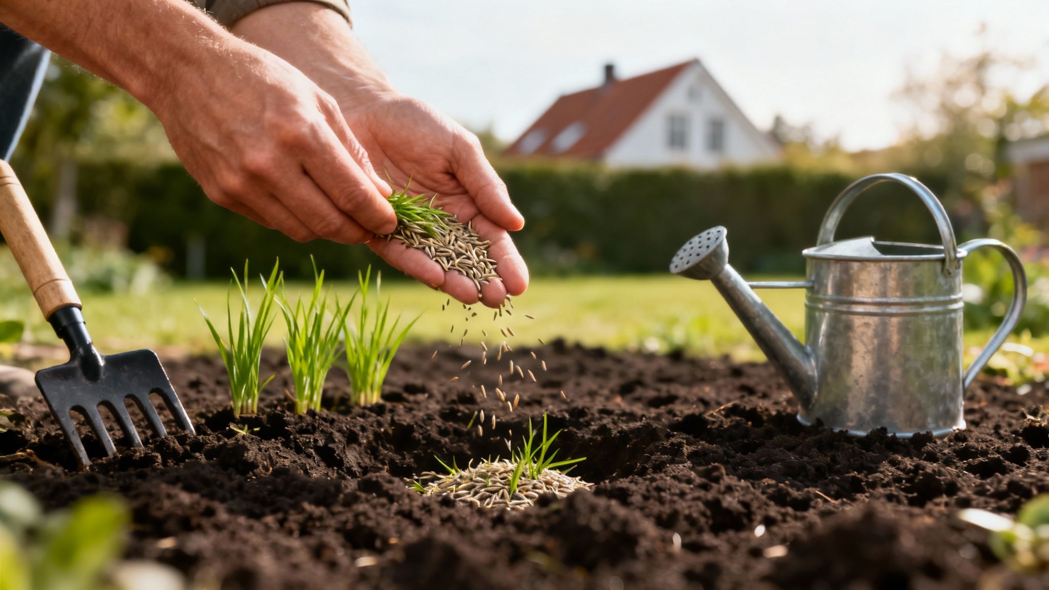 En person sår frø i jorden, mens græs vandes med en slange i en have.