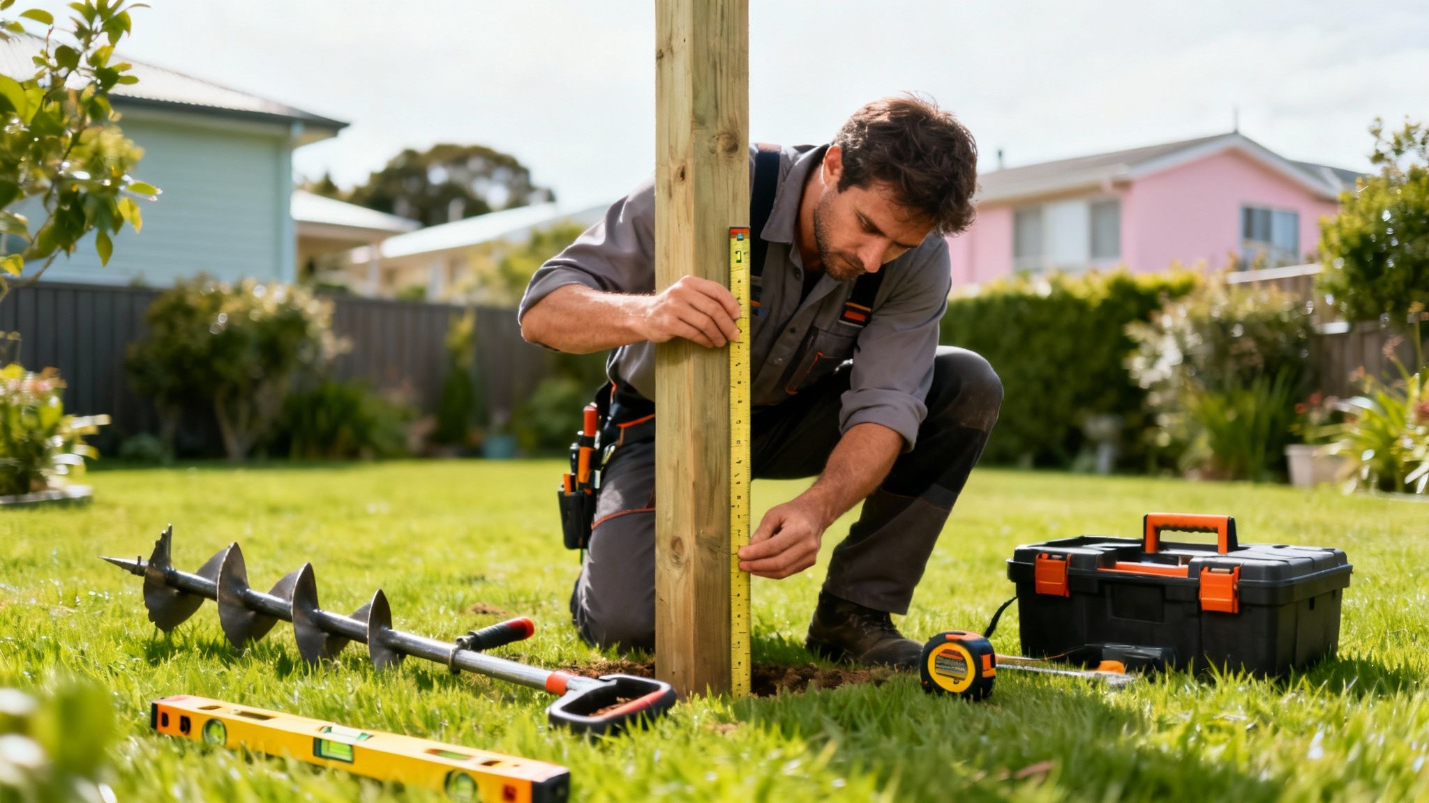 Denne proces med at fylde og stampe i lag er altafgørende. Den komprimerer jorden og låser stolpen fuldstændig fast, så den kan modstå vind, vejr og daglig brug. Skynder du dig og fylder hele hullet på én gang, vil jorden aldrig blive kompakt nok, og stolpen vil hurtigt begynde at give sig.