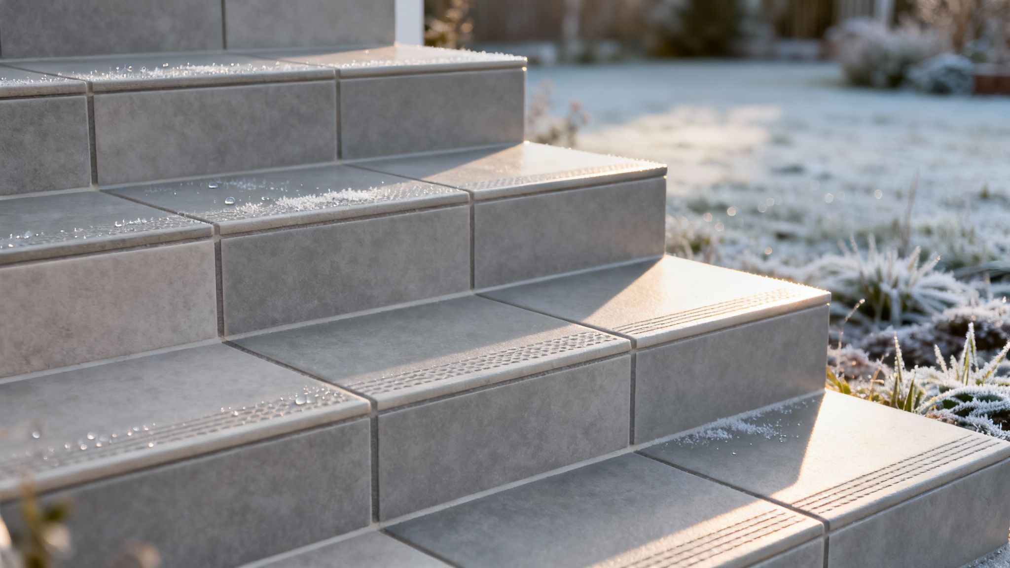 Den absolut vigtigste egenskab for udendørs fliser til trappe er frostsikkerheden. Det kan ikke siges tydeligt nok. En flise, der suger vand, vil sprænge, så snart frosten sætter ind. Det er ren fysik: vand udvider sig, når det fryser, og den kraft kan ødelægge selv de stærkeste materialer, hvis de er porøse.